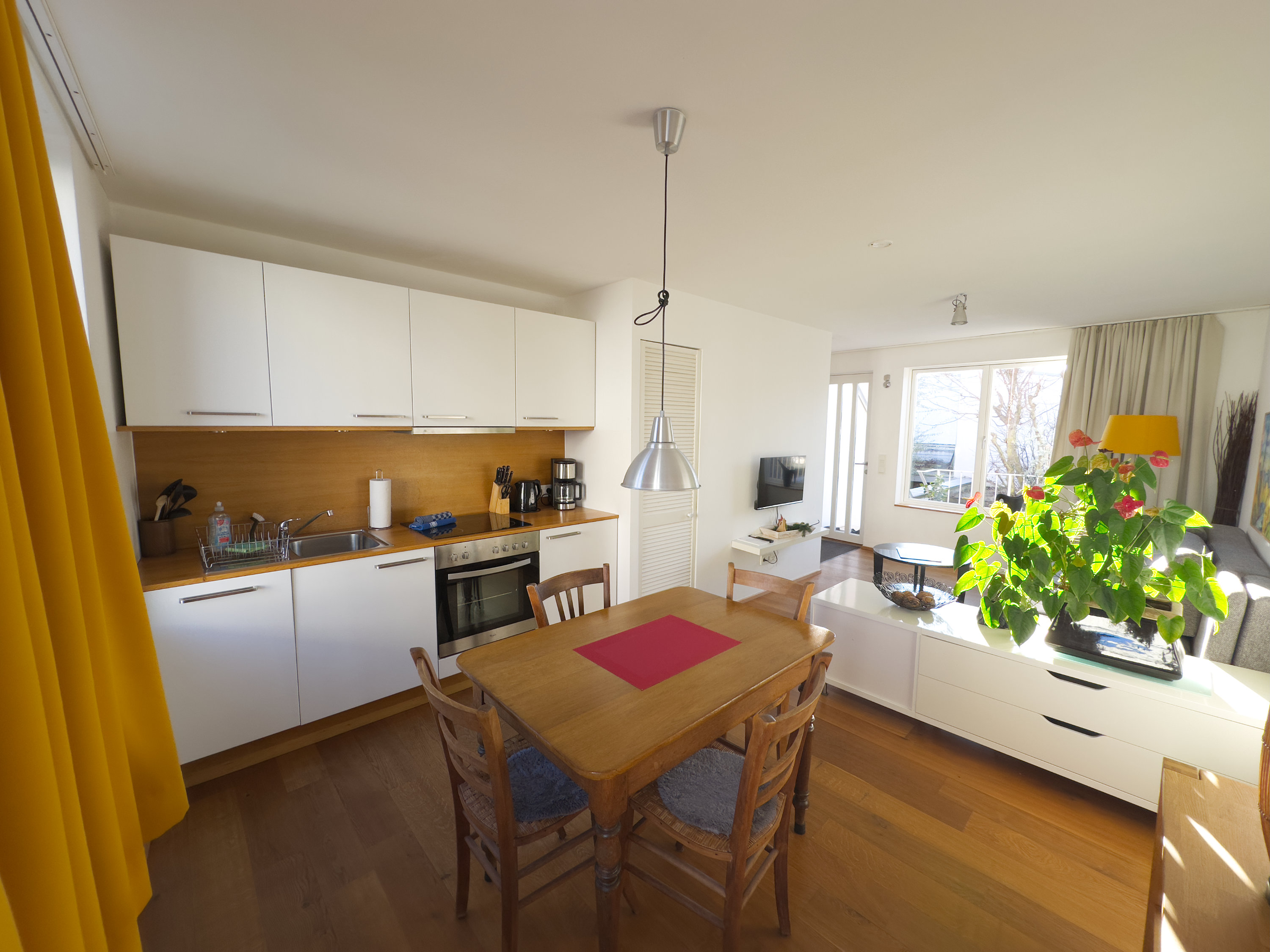 Mit ca. 38㎡ erstreckt sich die Wohnung über das erste und zweite Geschoss. Im ersten Geschoss befindet sich der Wohnraum mit Schlafsofa für 2 Personen, die voll ausgestatte Küche (Spülmaschine, Backofen, Herd mit Ceran-Kochfeld, Kühlschrank mit Gefrierfach) und der Esstisch. Im zweiten Geschoss befindet sich das Doppelbett und ein Badezimmer mit Toilette und Duschbadewanne.